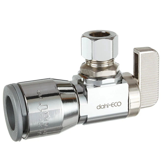 Dahl lead-free brass ball valve 90° supply stop with plated finish. Plated handle, 1/2″ PEX, CPVC or copper pipe Quick-Grip(TM) inlet port and 3/8″ OD copper pipe outlet port. Do not use with Kitec(R) , PEX-AL-PEX, Poly-B or plated pipes. Lifetime warranty. Certified CSA(R), UPC(R), ASSE 1061.