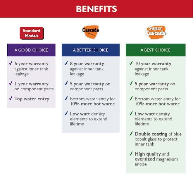 The electric bottom water entry water-heater from Giant® offers 10% more ready-to-use hot water. The interior of the tank is coated with blue cobalt glass enhanced with zircon, a feature unique to Giant®. This water heater is equipped with low density elements and adjustable thermostats with automatic temperature control. Its high-quality magnesium anode offers a greater protection against the corrosive effects of water. In addition, its GreenFoam® ecological foam insulation contains no HCFCs, CFCs nor VOCs. A complete exhaust pipe with 90° elbow, a fitting and a safety valve are provided. This product is manufactured in Canada and is backed by a 8-year limited warranty on tank perforation and 5-year warranty on parts. To benefit from the warranty, the water heater must not be laid on its side during transportation.