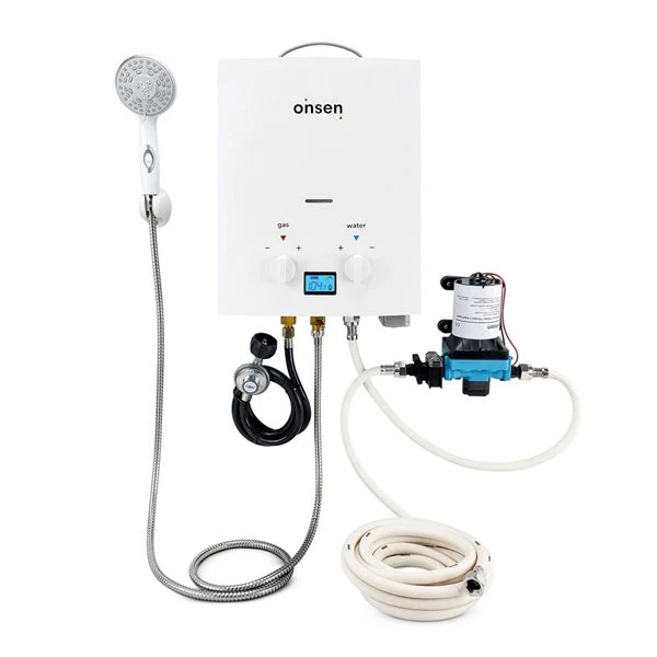 The Onsen 5-L portable tankless water heater turns cold water into instant hot water so you can enjoy a hot shower on all your outdoor adventures. Ideal for heating summer water temperatures of 60°F / 15°C and warmer, the Onsen 5-L runs on a standard propane tank and has an electronic ignition. Featuring a premium shower head, digital screen and included 12V battery clips, the Onsen 5-L is perfect for hunting camps, off-grid cabins, camping, boating, pet grooming, horse trailers, stables or simply rinsing off by the pool. Working in combination with the Onsen 3.0 diaphragm RV / Marine 12V water pump, the Onsen 5L will provide the comfort of instant pressurized, hot water in any off-grid situation. The Onsen water hose kit provides an easy solution for connecting a water source with the Onsen 5-L and the Onsen 3.0 pump. The kit includes two lengths of ½-in diameter hose: 7-ft for connection between water heater and pump and 16-ft for connection between water source and pump.